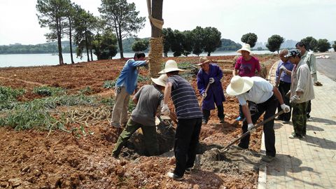 学校西区原来是一些散户的聚集地,散户的菜地、猪圈、鱼塘影响了校园的美观与正常地域的使用。去年夏天,学校决定对西区环湖区域进行改造。看似简单的工作其实并不简单,为了填塘、拆圈,绿化中心往往要跟散户打起“游击战”。“他们白天在学校里,我们只有等到他们晚上走了以后开始工作,也就是凌晨三点,一直干到天亮。实在撑不住了就回办公室休息会儿,然后再去现场。”张奥说道。在那段日子里,绿化中心的工作人员几乎是日夜坚守,正是武汉夏天炎热之时,每个人都晒脱了皮。