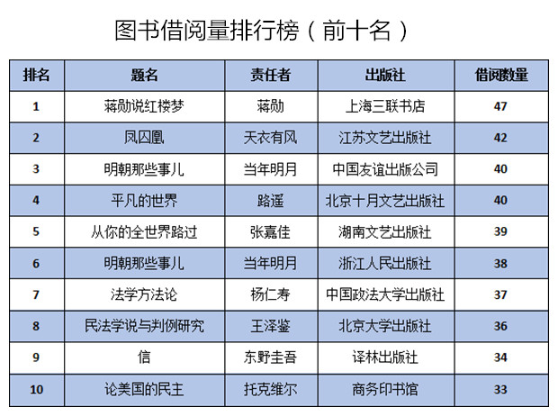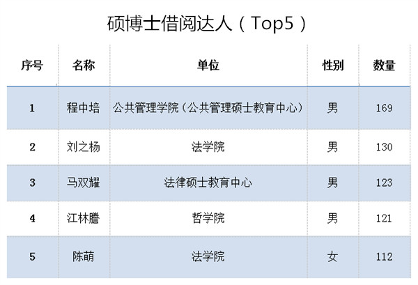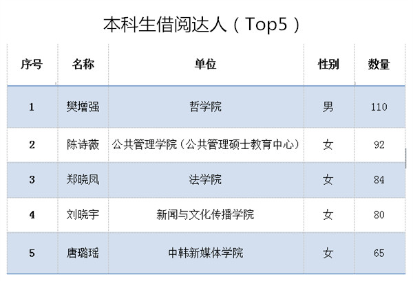 哲学院的樊增强、公共管理学院的陈诗薇、法学院的郑晓凤、新闻与文化传播学院的刘晓宇和中韩新媒体学院的唐璐瑶,是今年图书馆阅读榜的TOP5。樊增强在2016年借阅了110本图书,是全校本科生中唯一一个借阅量超过一百本书的学生。