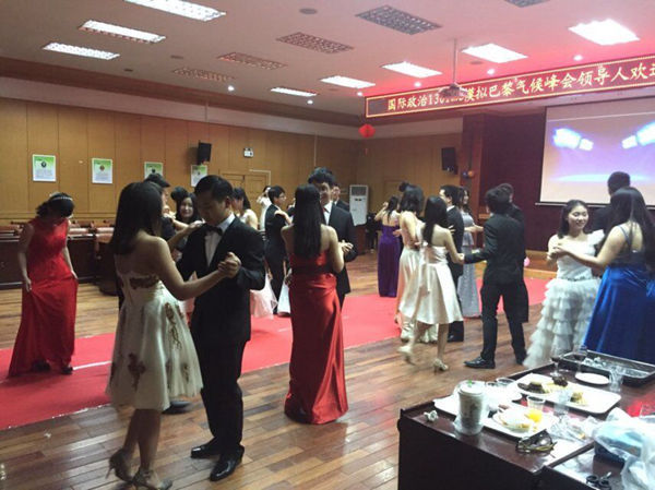 “文艺委员在筹备期间还给我们进行了两次‘扫盲舞会’,大半夜‘强占’文波楼地下的小车库教我们跳华尔兹。一些同学有缩脖、驼背的习惯,会导致仪态不端正,在国旗护卫队接受过两年训练的我就被大家推选出来教站姿。”回忆当初,哲学院国际政治1301的包阳阳同学忍俊不禁。从布置会场到租借礼服、从向院里其他老师投送邀请函到现场上台发表主旨演讲、从私下里勤学舞步到会场上的才艺PK,同学们都努力着。不论是模拟APEC会议还是G20峰会的酒会,为了成为一个合格的国家“领导人”,同学们学习的第二外语在这里得到了充分的应用:法兰西的代表用法语发表主旨演讲、日本国的代表一板一眼地日语发音、德意志代表操一口流利的德语……可谓是八仙过海,各显神通。