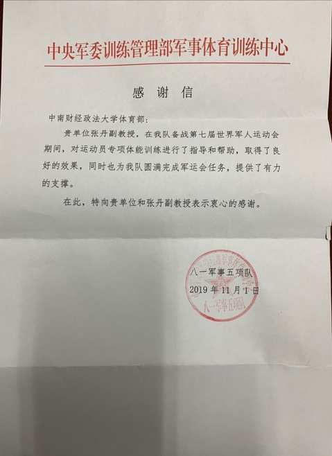 新闻网讯(学生记者 韩亚星 学生通讯员 冷子琦 雷艺多)在逐渐转冷的11月里,冬日阳光让人感到清新又明媚,两封感谢信的到来,更是如同一股暖流,流入我校体育部和张丹副教授的心间。11月1日,我校体育部收到一封来自中央军委训练管理部军事体育中心的感谢信,信中说明,在八一军事五项队备战第七届军人运动会期间,我校张丹副教授对运动员专项体能训练进行了指导和帮助,助力军事五项队圆满完成军运会任务;同月18日,军事体育中心八一海军五项队发来感谢信,对张丹副教授在军人运动会期间对海军五项队男、女一线运动员专项体能的悉心指导并助力海军五项队圆满取得6块金牌一事,表示了诚挚的谢意。