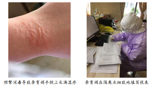 除了正常工作任务,李育娟还要解答98位隔离人员的各种问题:“我和我妻子咳嗽,能给我联系去做检查吗?”“我没事,我不想去做检查!”……虽然工作任务重,穿着的防护服密不透风也会显得格外累,但李育娟每次都会耐心的帮大家解答,正如她所说:“大家在这里多少都会焦虑,帮他忙解答问题对他们也是一种回应和安慰,所以我们苦点累点算不了什么。”