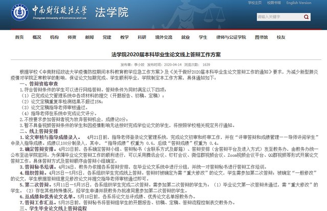 4月10日,学校教务部发出《关于做好2020届本科毕业生论文答辩工的通知》,确了本年度本科毕业生将采取线上答辩的方式来完成大学四年的“最后一课”,据此,各学院分别制定了切合各自学科特点的答辩流程方案。各学院“云答辩”方案坚持合法、合规、规范、公正、公开的原则,保持“云答辩”学术水平和工作程序与线下答辩一致。