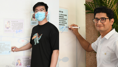 座谈会开始前毕业生代表们在签名墙上签名。同时,校党委书记栾永玉、校长杨灿明在毕业文化衫上签名。