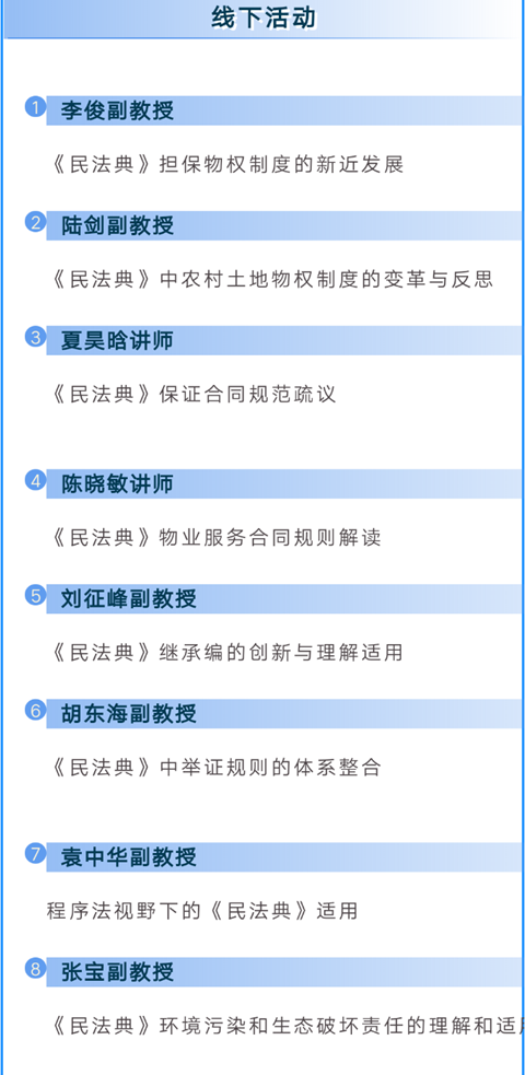 本次活动分为线上和线下两部分,围绕《民法典》各编展开交流。线上活动时间为2020年8月24日至9月16日,每周一、三、五晚19:00-21:00在中国知网在线教学平台进行直播。线下活动时间为2020年10月1日至12月30日。课程安排详情如下:
