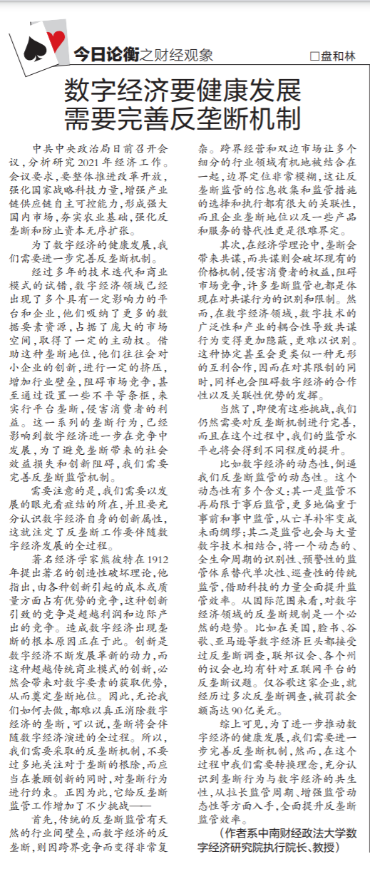 为了数字经济的健康发展,我们需要进一步完善反垄断机制。