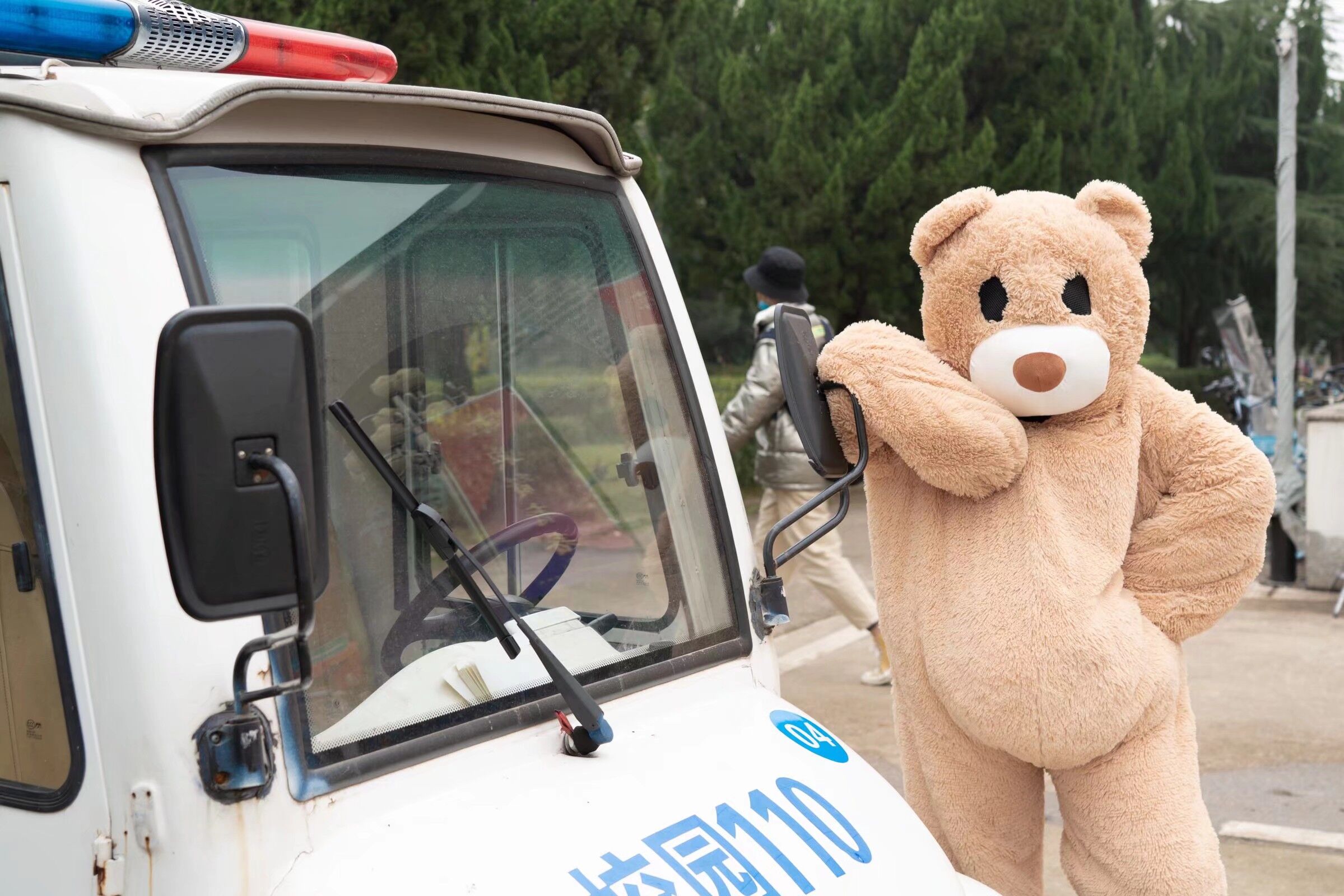 “小熊保安特别喜欢拥抱,因为这是双方张开双臂彼此信任才能完成的动作,互相温暖,互相充电,真的是非常美好的事情”。小熊保安告诉我们,有次在首义校区的时候,小熊在体育场附近活动,有个路过的女孩子询问是否可以拥抱一下,当短暂的拥抱过后,女孩子突然在小熊保安的怀里抽泣。也许我们每个人都有情绪低落的时刻,一个治愈的拥抱或许可以改变很多。在当小熊保安“站岗”“保护”大家的时候,小熊经常会收到很多人的问候,在12月开展的志愿者嘉年华现场,小熊保安在首义广场活动了一下午,在长椅上休息时志愿者倒了一杯水、拿了很多糖果过来,“虽然我不方便吃东西,但是这份心意真的让我倍感温暖”。我们都是孤单的行星,但是我们可以互相温暖。小熊保安存在和活动的意义便是让更多的人感受这份温暖,传递这份温暖。