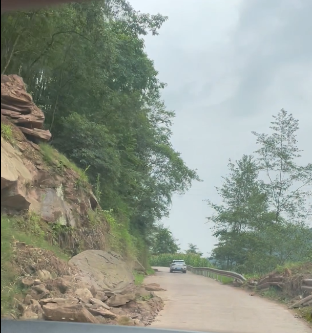 箭坝村坐落在大山中,路上随处可见山上的落石,一路上大家