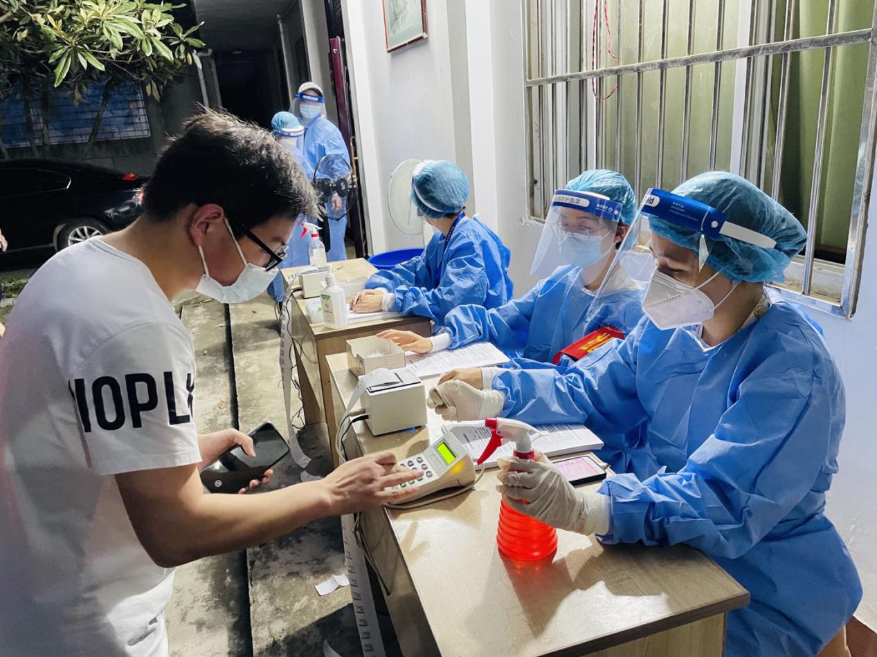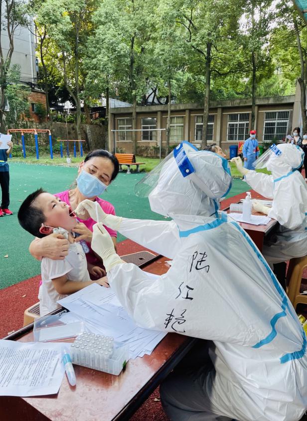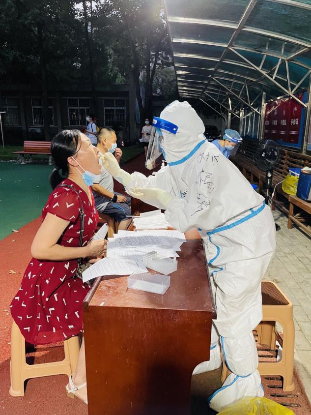 “有人行动不便,我们上门去核酸采样!”5日晚9时,正在忙着采样的公共卫生科医生陆红艳接到志愿者的求助,一位老人行动不便,不能来采样现场。陆红艳穿着厚厚防护服步行4楼,每走一步都很艰难,每上一层楼梯都觉得累极了。“陈教授,您好!请张开嘴巴,说啊——啊——”在这位70岁老人的家里,顺利地为他采集咽拭子。“你们本来就很累了,这么大热天还上门来为我服务,谢谢你们啊!”陈教授连声道谢。陆红艳衣服早已全部汗湿了,她顾不上休息,“我们要用最快的速度完成核酸检测任务”,又匆匆返回了采样现场的岗位上。