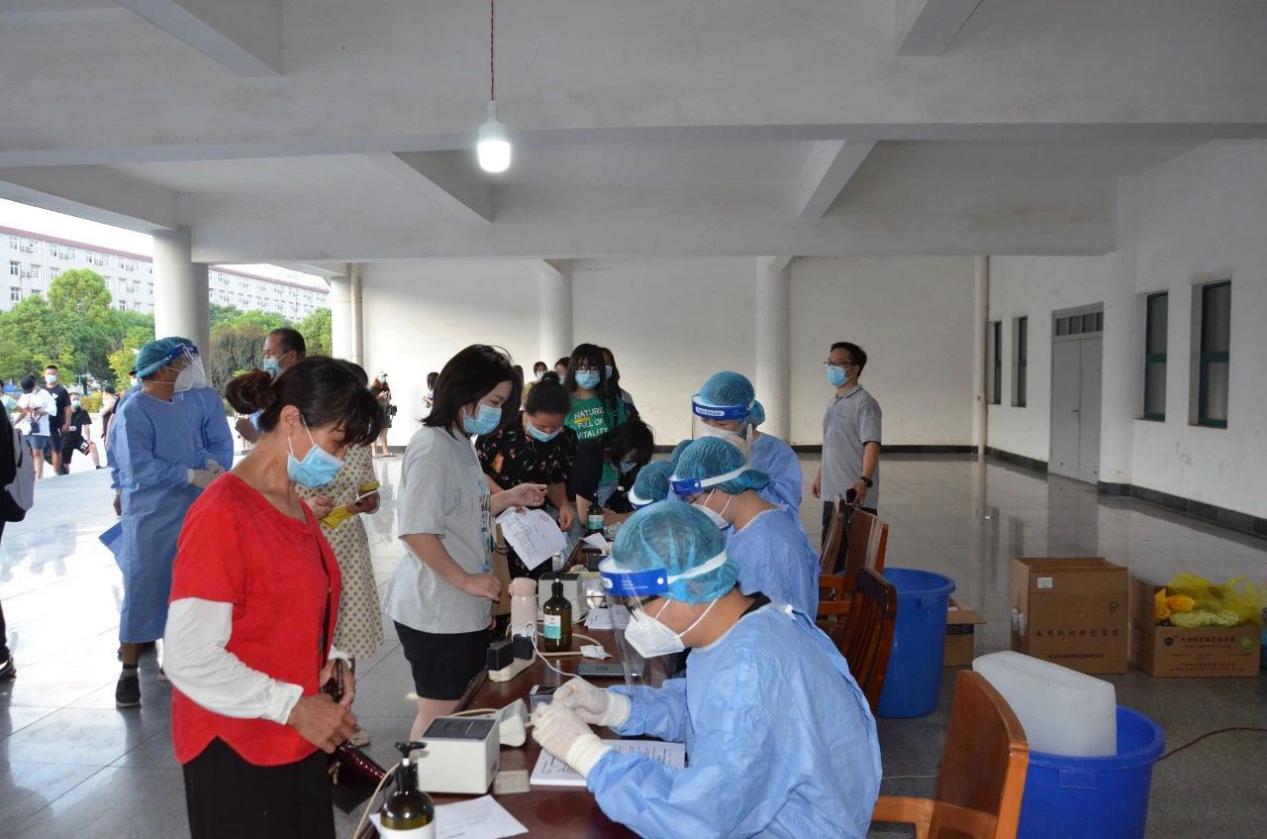 按照学校新冠肺炎疫情防控指挥部的工作部署和安排,校医院在校艺体中心、离退休人员工作部和文澴楼等处分设3个检测点,每天18:00—23:00,分时段、分批次为在校师生员工和社区居民展开免费全员核酸检测采样。8月4日下午检测开始前,学校领导先后赴3个核酸采集现场检查指导工作,看望慰问了医务人员和师生。校医院领导班子始终坚守在防疫一线,带领全院干部职工,克服一切困难,全力确保检测工作高效完成。