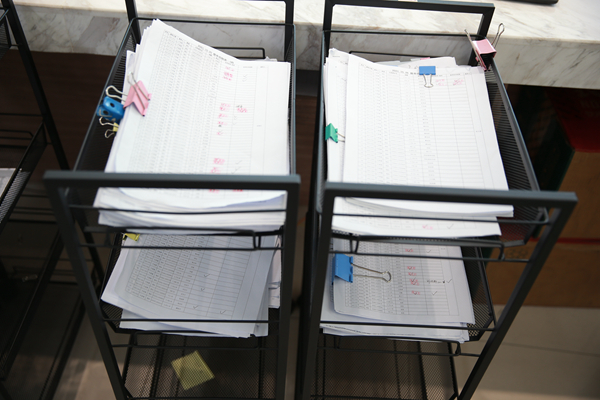 在财务服务大厅,1号、2号、3号窗口是专门处理被挂起单子的窗口。“老师们接到退单电话通知后就会到这三个窗口来取退单,我们的工作人员会直接与老师沟通,告知其需要补充的材料等。”财务部部长助理施英指着被退单堆满的小车说道。
