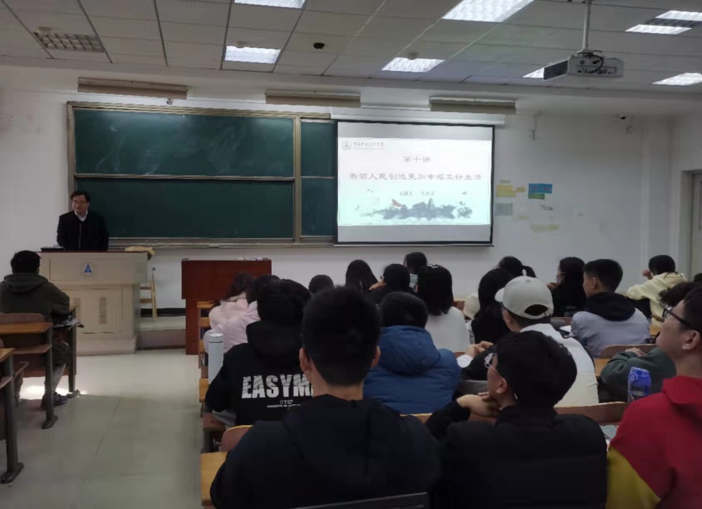 在课堂导入环节,侯振发副书记结合自己过去读书期间的生活境况以及现代大学生的校园学习生活情况,通过鲜活的案对比阐明了不同年代人们对美好生活的认知和向往是不一样的,进而告诉同学们美好生活是一个历史范畴,美好生活的实现需要一个不断的历史发展过程。同时,侯振发书记强调,幸福美好生活需要党的坚强领导、国家强大的经济实力、社会民生政策保障、个人努力等多方共同作用才能实现。