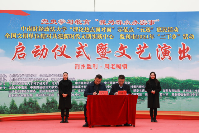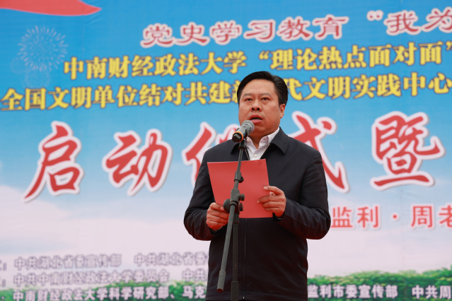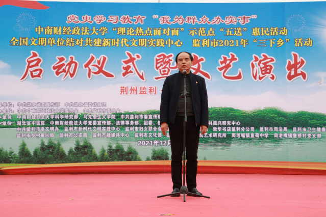 邹进文在启动仪式上发表讲话。他总结了我校自2013年来遵照《理论热点面对面示范点建设实施方案》要求,充分发挥“经法管”的学科优势,开展宣讲300多场,累积投入建设经费79.23万元,通过理论宣讲、教育扶贫、法律咨询、医疗服务、文艺汇演等系列惠民活动为监利市多地的理论、法律、技术、文化、致富项目建设提供大力支持。我校“示范点”建设已实现在监利市范围的全覆盖,宣讲范围也由最初的全体干部扩大到全体村民。我校示范点建设工作也多次被省委讲师团考核评定为“优秀”。在中国共产党建党一百周年之际,在“两个一百年”奋斗目标历史交汇的重大时刻,在学习党的十九届六中全会精神的火热时刻,我们开展校地合作式的“五送”惠民活动,我校与监利市再次达成新的合作协议,定能推动“理论热点面对面”示范点建设再上新台阶,展现校地合作的新担当、新作为。