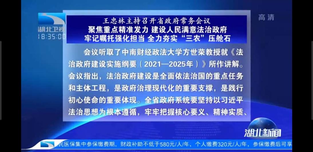 新闻网讯(通讯员 杜钟浩)2021年12月31日,湖北省委副书记、省长王忠林主持召开省政府常务会议。会议听取了法学院方世荣教授对中共中央、国务院印发的《法治政府建设实施纲要(2021—2025年)》所作的讲解。