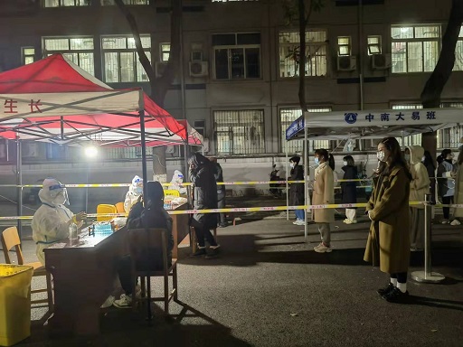 保卫部拉设警戒线、维持核酸检测秩序,配合做好楼栋消杀、送餐等工作;后勤保障部从餐饮供应、增设专用垃圾箱、定期消杀、成立水电维修专班响应封控楼栋、快递代收发等方面为封控楼栋学生做好生活保障;校团委第一时间组织成立以团学骨干为主的战疫青年突击队,全面对接防疫志愿服务工作,全力配合做好防控管理;教务部、研究生院和信息管理部联合开展线上线下混合教学,为学生制定专门的教学方案,采用直播、慕课、网课等方式,及时分享课堂信息,供学生在线自主学习,并提供在线答疑指导;国际教育学院密切关注在华国际学生的身体健康状况,通过邮件、微信等,发送疫情防控相关措施;各学院相关负责人和辅导员坚守在封控楼栋第一线;南湖社区安排下沉党员充实一线防控力量,协助做好联防联控排查系统排查以及环境消杀、核酸检测等工作。