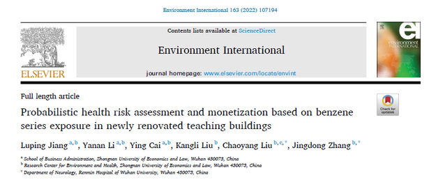新闻网讯(通讯员 杨晨 学生通讯员 王运玲)近日,信息与安全工程学院环境与健康研究中心团队在国际环境领域顶级期刊Environment International(中科院一区Top,IF=9.621)发表题为“Probabilistic health risk assessment and monetization based on benzene series exposure in newly renovated teaching buildings”的研究论文。米兰电竞·(中国区)为该论文第一署名单位,中心2021级博士研究生蒋路平为论文第一作者,刘朝阳副教授、张敬东教授为论文共同通讯作者,中心博士研究生李亚男、蔡莹,硕士研究生刘康丽为论文主要参与者。