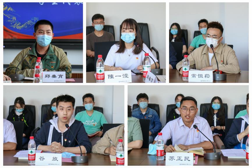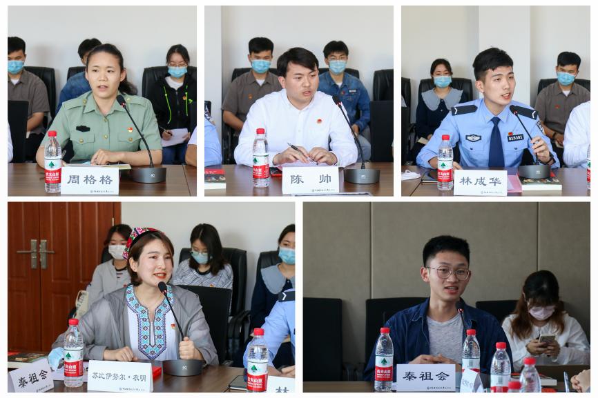 最美“当代花木兰”周格格经过部队磨炼与培养,在组织的关怀中成长为合格的解放军战士,她以优秀战友为例,激励青年以实践与行动诠释青春。陈帅秉持对梦想的追求与执着的毅力,在求学之路上奋勇不屈,在毕业之际表示要敢为人先、勇往直前,在青春的赛道上永不落后。福建警官学院交流生代表林成华从一名公安院校交流生的角度,阐释了家国责任与社会担当是青春的底色,高远的理想与不懈的奋斗是青春的意义。少数民族代表苏比伊努尔·衣明在学校的支持下得以专注学业,作为一名少数民族学生党员,她将以实际行动诠释担当,将小我融入大我。本科生第四学生党支部副书记秦祖会通过分享自己组织参加抗疫志愿服务的经历,表示作为学生党员,要将学习成长同社会和人民的需要密切结合起来,用青春铺路,让理想延伸。