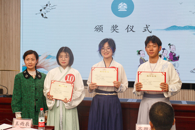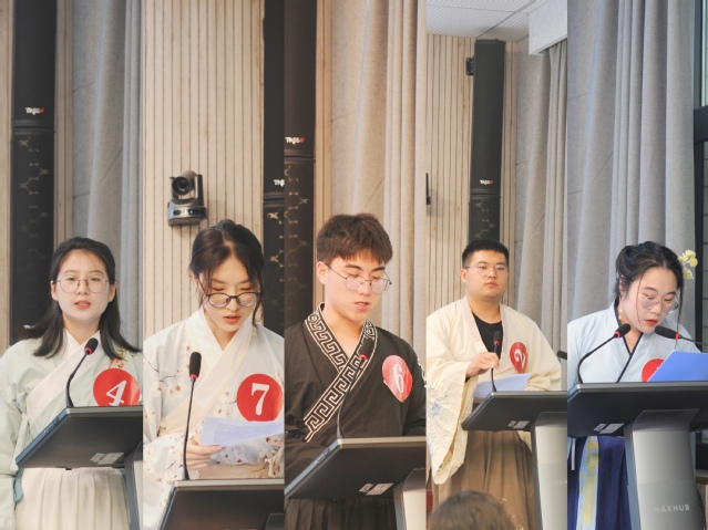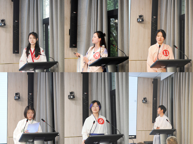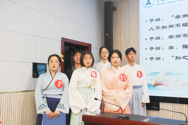 8位本科生和3位研究生身着汉服,将自己置身于儒学的历史长河之中,从《论语》中的人格品质、理想追求、人际关系、国家治理四个方面分享了读书感悟。《论语》非常强调人格品质的完善,滕菲、李娜通过分析“孝”的思想,认为对父母长辈要事之以礼。《论语》中的人际关系处理一直是重点内容,杨文杰浅析了友谊观,大学同学之间要“切切偲偲,怡怡如也,可谓士矣”,追求君子之交。《论语》中有关理想追求的内容,也受到了同学们的追捧,郑宇、韦晨依探讨对“仁”的追求,相信“我欲仁,斯仁至矣”;兰静雯通过分析“君子不器”,呼吁大家要立大志、成大器;张李可、马悦通过探讨孔门三乐与“仁”的三重境界,认为君子要有所为、有所争,实实在在地践行仁义,有“朝闻道,夕死可矣”的洒脱,有士不可不弘毅的品质,人生才能有所建树。治国平天下是《论语》的至高追求,杨佩珍、郑雅临通过探讨“无为而治”,倡导恭肃己身,为政以德,把民众与为政者比作鱼水,才能使得国泰民安;王睿探讨国与国之间也要以礼敬之,不可随意攻伐。