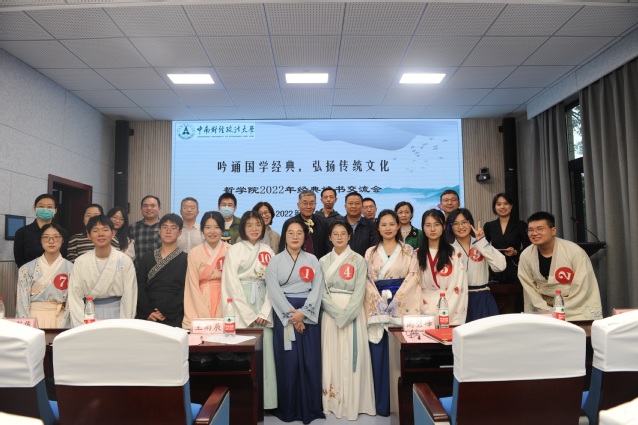 新闻网讯(学生通讯员 彭心悦)“子曰:‘学而时习之,不亦悦乎?有朋自远方来,不亦乐乎?人不知而不愠,不亦君子乎?’……”5月19日下午,伴随着清雅从容、音韵高古的古琴曲,在哲学院张舜清教授的领诵下,11名身着汉服的学生与哲学院党政领导、系主任、班导师一起品味国学,重温经典,至此,哲学院2022年“吟诵国学经典 弘扬传统文化” 《论语》品读会圆满落幕。