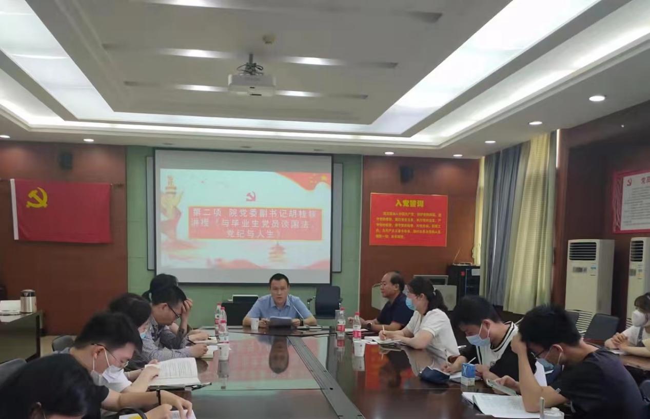 本次主题教育采用线上线下相结合的方式进行。学院党委书记殷修林、党委副书记胡桂锬主讲,学院党政办主任姚健主持。全体毕业年级党支部书记、党务秘书、毕业生党员参加活动。