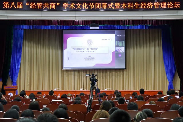 新闻网讯(通讯员 何强 学生记者 刘洋 摄影 李一平 李娟宇 任瑞 梁桂华)5月28日,工商管理学院第八届“经管共商”学术文化节暨本科生经济管理论坛在南湖校区文泉楼报告厅举行。校党委学生工作部部长余小朋、副部长石凌,校团委副书记夏东伟,校教务部副部长柳正华,工商管理学院院长钱学锋、副院长费显政、党委副书记李芳以及500余名师生线上线下参加活动。李芳主持会议。