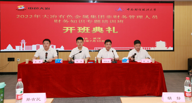 新闻网讯(通讯员 曾诚)7月10日,2022年大冶有色金属集团非财务管理人员财务知识培训班在我校首义校区顺利开班。大冶有色金属集团(下简称“公司”)党委副书记、工会主席王勃,学校党委常委、副校长刘仁山,学校继续教育学院副院长石龙出席开班仪式。开班仪式由公司人力资源部主任吴展主持。