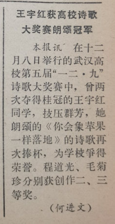 武汉高校第五届“一二·九”诗歌大奖赛中,程道光获创作二等奖。(第172期1988年12月20日(第一版))