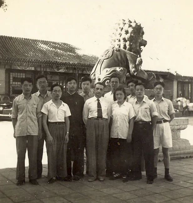 ▲1951年,在中国人民大学学习的刘都庆(左四)与苏联专家合影于颐和园门前