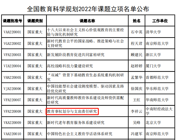 根据公布名单显示,本年度国家重大课题全国共计10项,其中学校财政税务学院李祥云教授主持申报的《教育事权划分与支出责任研究》获得国家重大项目立项,课题批准号:VFA220008。