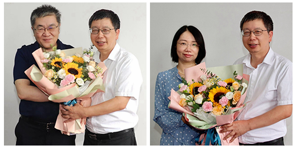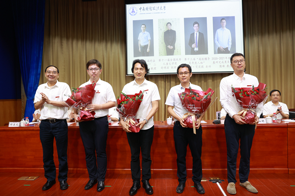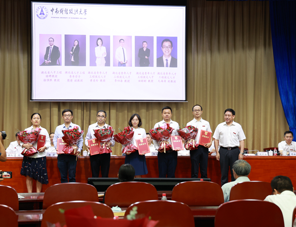 党委常委、副校长姚莉为国家级人才工程青年拔尖人才詹新宇教授、湖北省政府专项津贴专家胡弘弘教授、湖北省有突出贡献中青年专家张琦教授、湖北省高等学校名师工作室主持人钱学锋教授颁发证书及鲜花