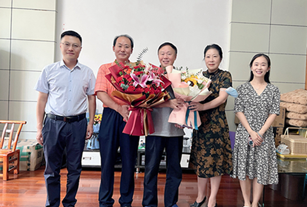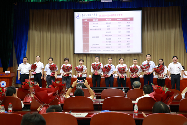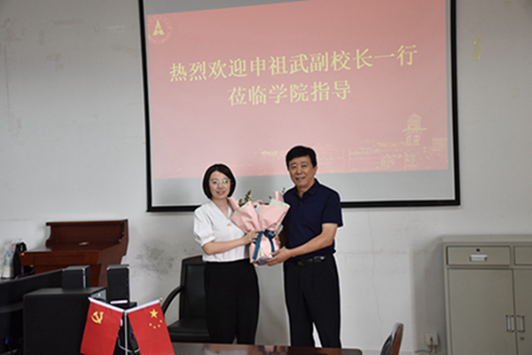 党委副书记、纪委书记侯振发,党委常委、副校长刘仁山为入选国家级一流本科专业建设点负责人赠送鲜花
