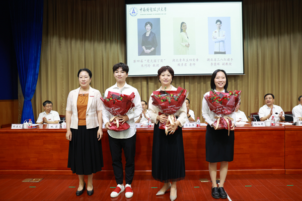 党委常委、副校长姚莉为湖北省第四届“楚天园丁奖”获奖者朱巧玲教授、“湖北青年五四奖章”获奖者赖彦君老师、“湖北省三八红旗手”李茵晖副教授赠送鲜花