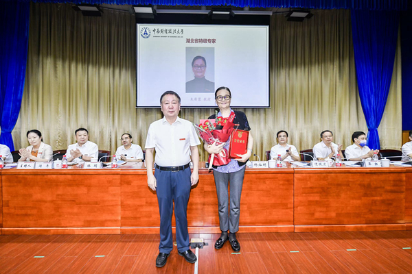 党委副书记、校长杨灿明为湖北省特级专家朱新蓉教授颁发证书及鲜花