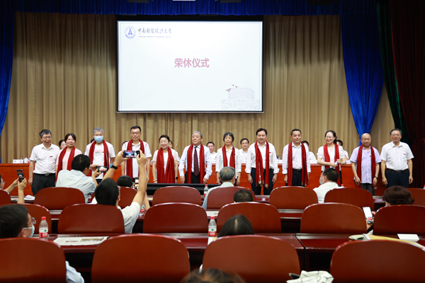 党委常委、副校长覃红,副校长邹进文为荣休教职工代表佩戴丝巾