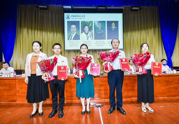 党委副书记陈明为“第八届钱端升法学研究成果”二等奖获奖者陈柏峰教授、第十一届全国优秀儿童文学奖获奖者舒辉波副教授、第十三届“高校辅导员年度人物” 获奖者尼加提·艾买提老师、“2020-2021年度商务发展研究成果奖”获奖者熊峰教授赠送鲜花