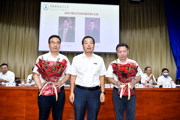 党委书记栾永玉为入选首批中国经济学教材主编杨灿明教授、常明明教授赠送鲜花
