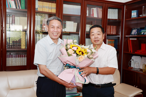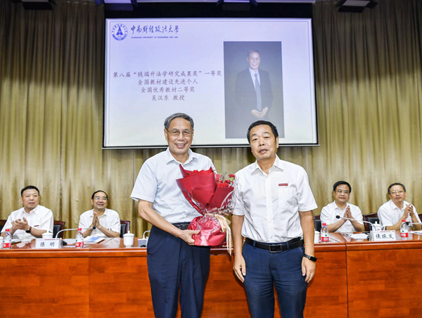 党委书记栾永玉为“全国教材建设先进个人”、全国优秀教材二等奖获得者、“第八届钱端升法学研究成果”一等奖获奖者吴汉东教授赠送鲜花
