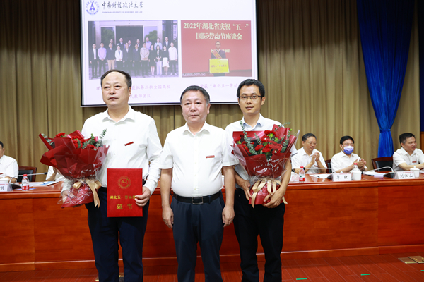 党委副书记、校长杨灿明为第二批全国高校黄大年式教师团队理论法学教师团队负责人陈柏峰教授、“湖北五一劳动奖状”获奖单位法学院赠送鲜花