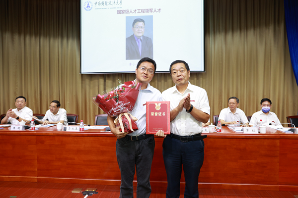 党委书记栾永玉为国家级人才工程领军人才李小平教授颁发证书及鲜花