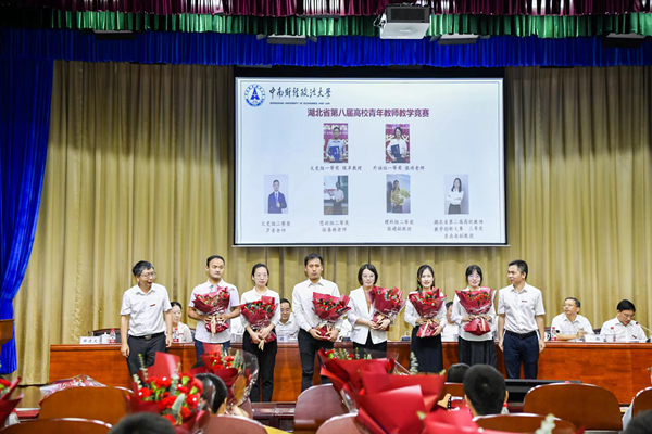副校长邹进文,党委常委、副校长周铭山为湖北省第八届高校青年教师教学竞赛一等奖第一名获得者侯卓教授和张琦老师、二等奖获奖者及第二届湖北省高校教师教学创新大赛三等奖获奖者赠送鲜花