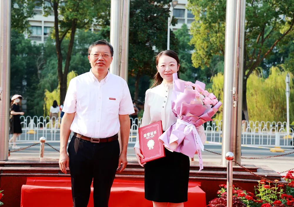 校党委常委、副校长覃红为2002级国际法系(2006级经济法系硕士)校友徐艺颁发“校友之星”证书
