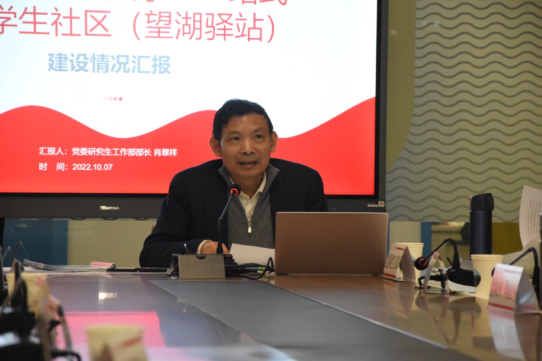 党委研工部部长肖翠祥针对“一站式”南湖学生社区中望湖驿站的建设情况,从建设意义与背景、建设理念与思路、建设方案与实施、未来展望与举措四个方面进行了汇报。他表明“一二三四五”工程的建设理念,即“一个园区”为共同价值观念为联结的研究生教育生活成长共同体,凭借校研究生会功能型党支部、望湖公寓研究生管理委员会“两个抓手”,领导力量、师生力量、服务力量“三支力量”,坚持人在一线、心在一线、思在一线、干在一线“四个一线”,建立决策共谋、发展共建、建设共管、效果共评、成果共享“五共新模式”。他提出将“一站式”学生社区打造成文明型、学习型、健康型、青春型特色园区的综合管理目标,与“以党建为引领、以社区为中心、以宿舍为载体、以队伍为抓手”的建设要旨。随后,他展示了望湖驿站的建设方案与相关学院“一站式”南湖学生社区的建设情况,对望湖驿站内学术研讨室、党员活动室、辅导员工作室、导师工作室等功能房的投入使用情况及未来规划进行介绍。
