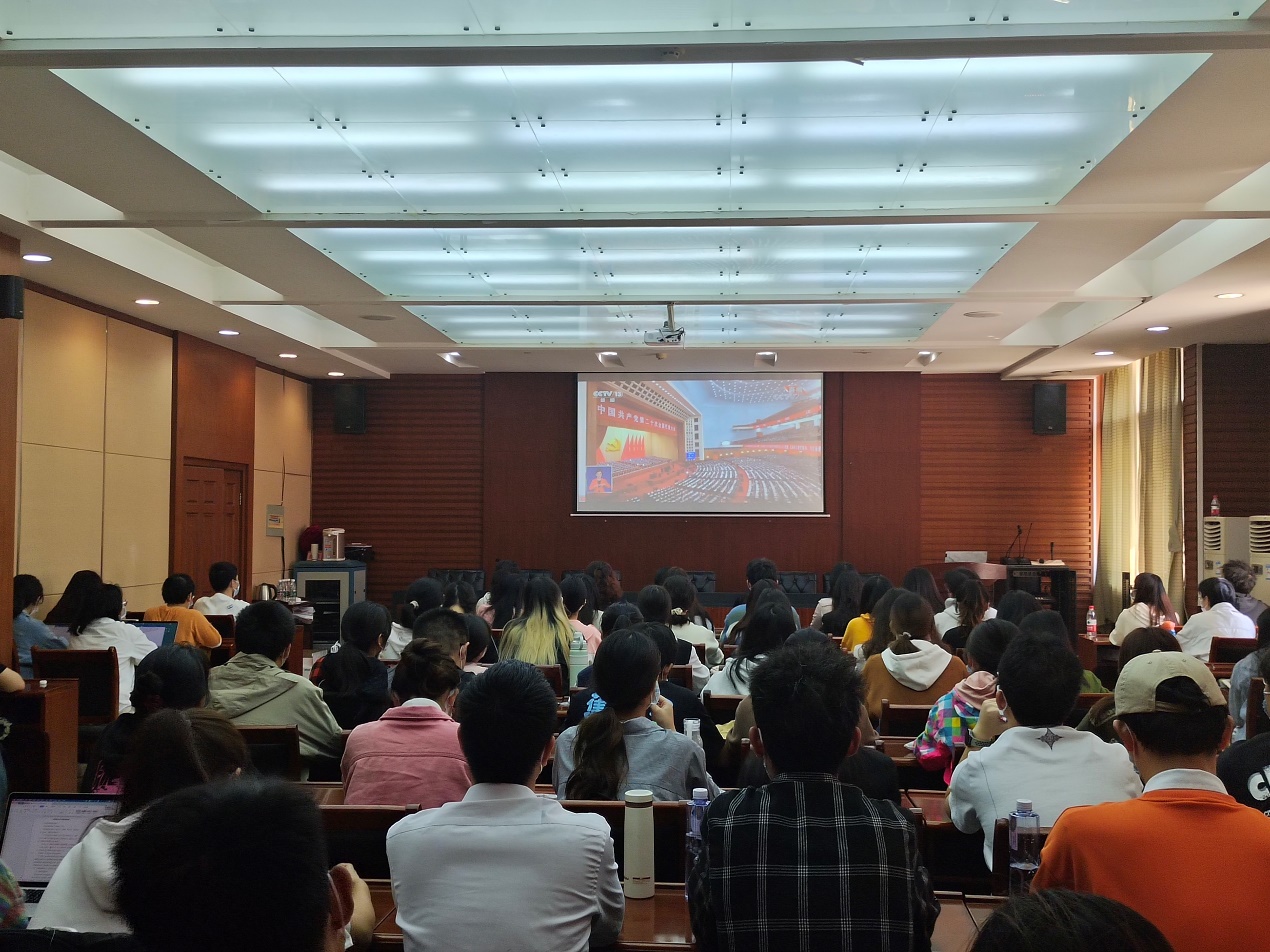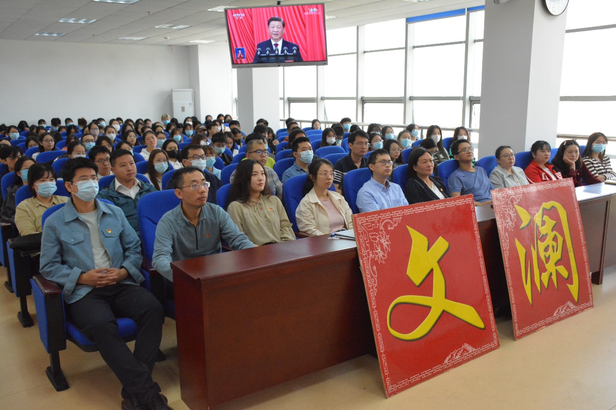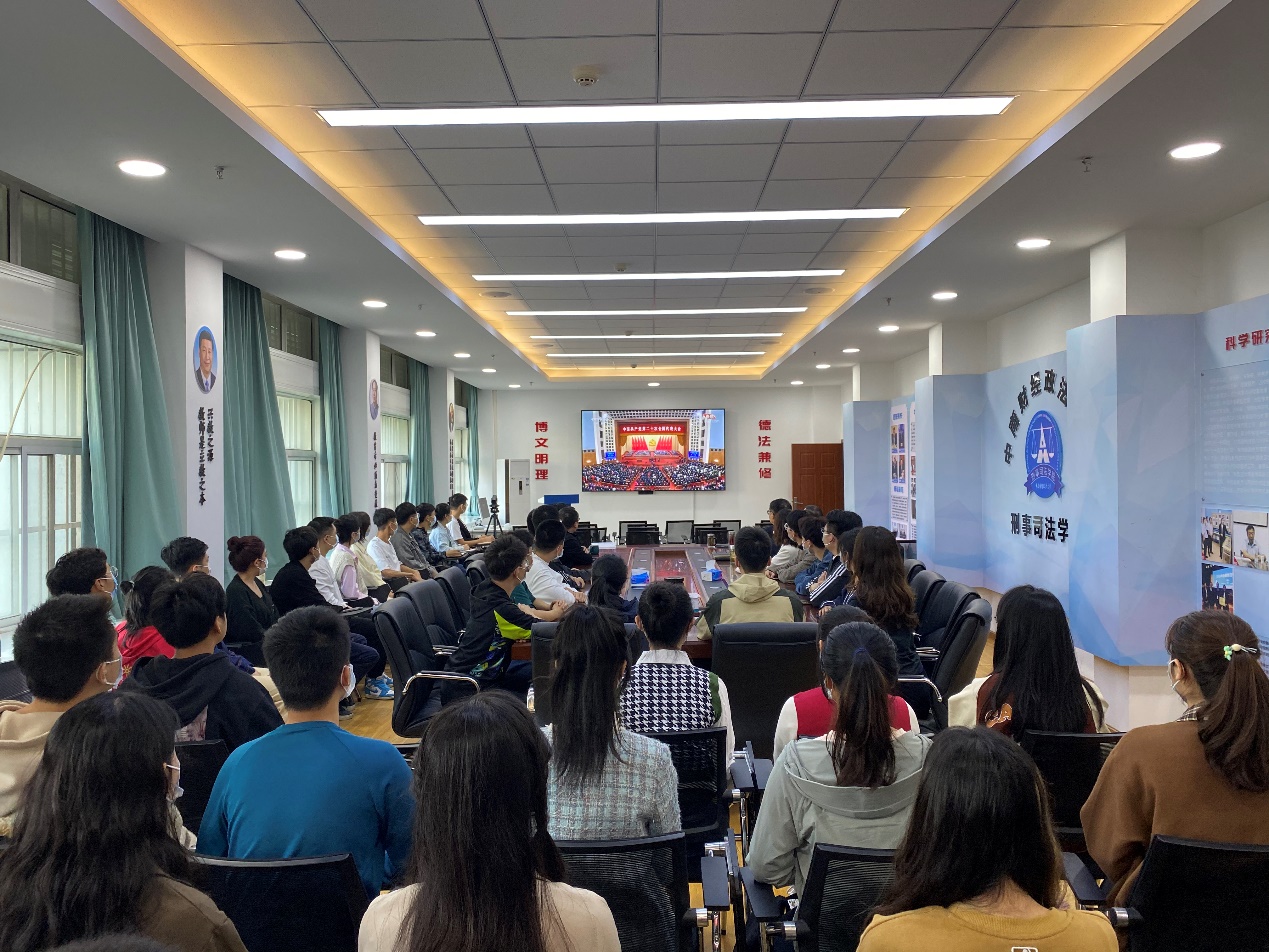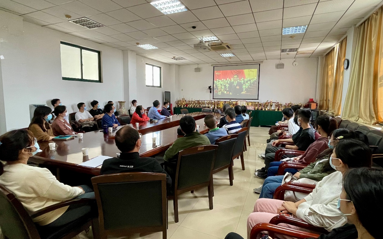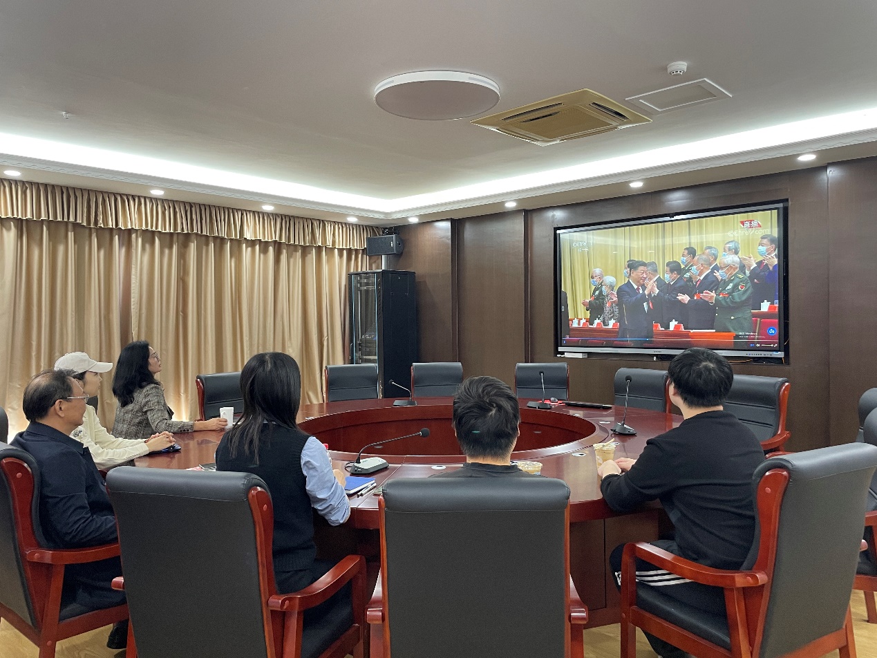 校党委常委、民主党派校领导,党务部门代表,学校各民主党派代表,统战团体代表,学校老年协会代表及师生代表在文澴楼南附楼一楼同声传译国际会议室集中收看大会盛况。