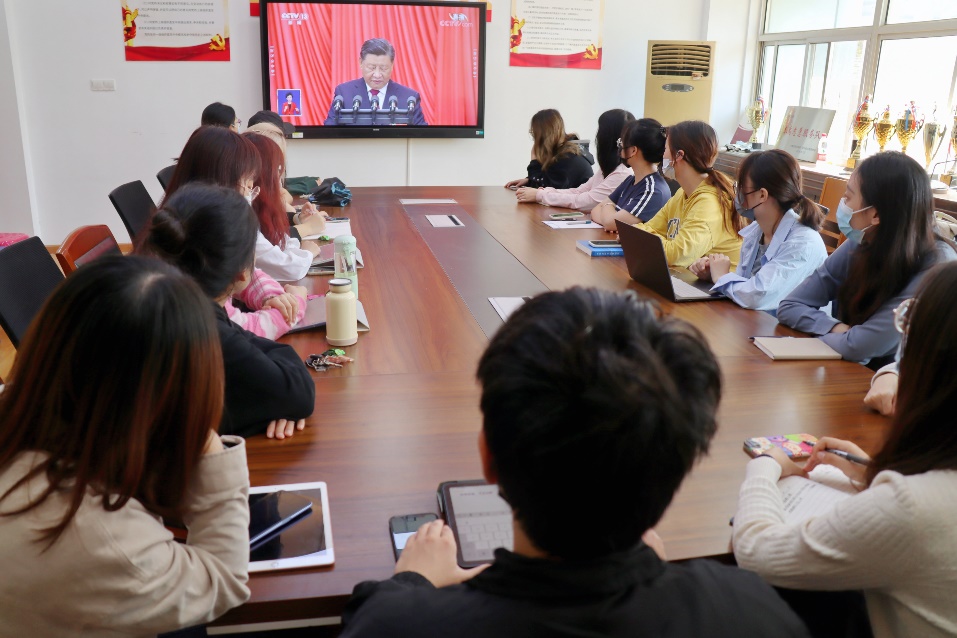 新闻网讯(通讯员 吕瑞 王永胜 于淼 摄影 吴皓亨)10月16日上午,中国共产党第二十次全国代表大会在北京人民大会堂隆重开幕,习近平总书记出席大会开幕会,并向大会作报告。法学院广大师生密切关注大会召开,法学院党委第一时间组织党委委员,法学院、知识产权学院、法律硕士教育中心领导班子成员,教师党支部书记,党政管理干部和学生辅导员,在文治615会议室集中观看大会直播。广大师生也通过电视、网络等媒介主动了解大会动态,热议党的二十大报告。