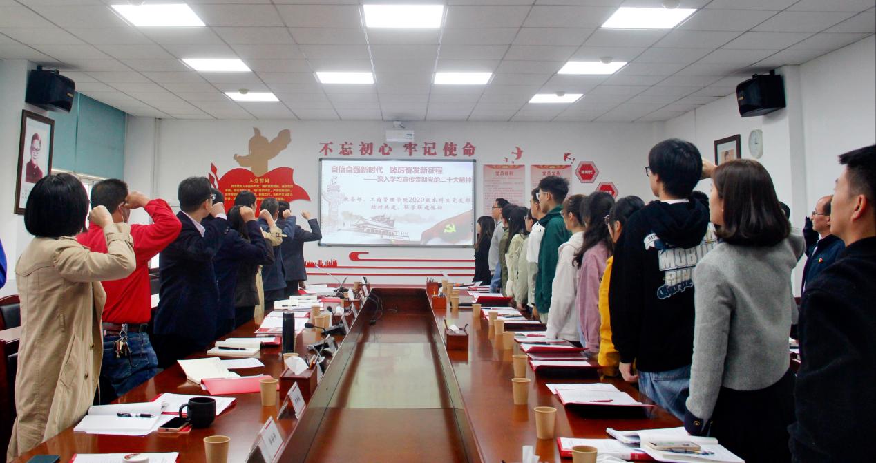 在理论学习环节,郝新春、王运达两位同志领学了《习近平:在中国共产党第二十次全国代表大会上的报告》《高举伟大旗帜 创造新的伟业 ——热烈庆祝中国共产党第二十次全国代表大会开幕》等文件材料,他们从教学管理者角度出发,畅谈时代赋予自身的责任与挑战,要主动扛起时代的重任,埋头苦干、奋勇前进做好教学服务工作,为党育人,为国育才。林杰从辅导员角度,分享了学习二十大的体会,要与本职工作紧密结合,组织并带领学生党员深入学习党的二十大精神,为祖国伟大复兴做出自己应有的贡献。工商管理学院2020级本科生代表纷纷围绕青年人的使命与担当分享个人感想。