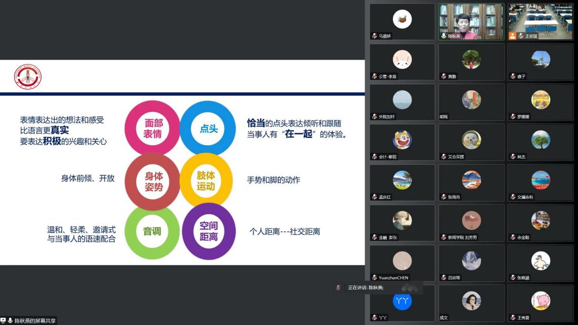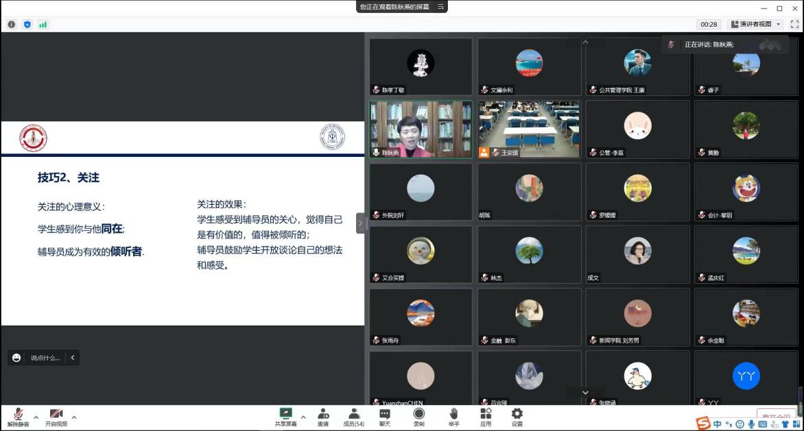 陈秋燕教授表示,“一次单元谈话技术”模式包括“安全信任、了解问题、察觉领悟、心理教育和行动改变”五个阶段,谈心技巧可用于个别谈话、三人谈话、寝室沟通、班级建设等用途,进而帮助学生适应大学生活、缓解考试焦虑和学习压力、处理情绪问题、解决人际交往问题等。