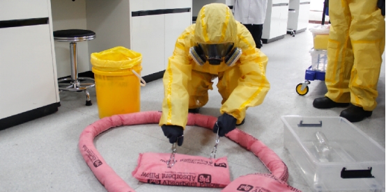 活动第二部分是危化品泄漏应急演练。模拟“浓盐酸泄漏事故”场景,现场人员按照实验室安全应急预案有序完成紧急撤离、人员疏散、事故警戒、事故报告、应急处置、环境恢复等环节。本次演练进一步检验了实验室应急预案的合理性,让师生掌握实验室突发事故正确的应变措施,科学有效地实施处置,切实降低和控制安全事故的危害程度和范围。