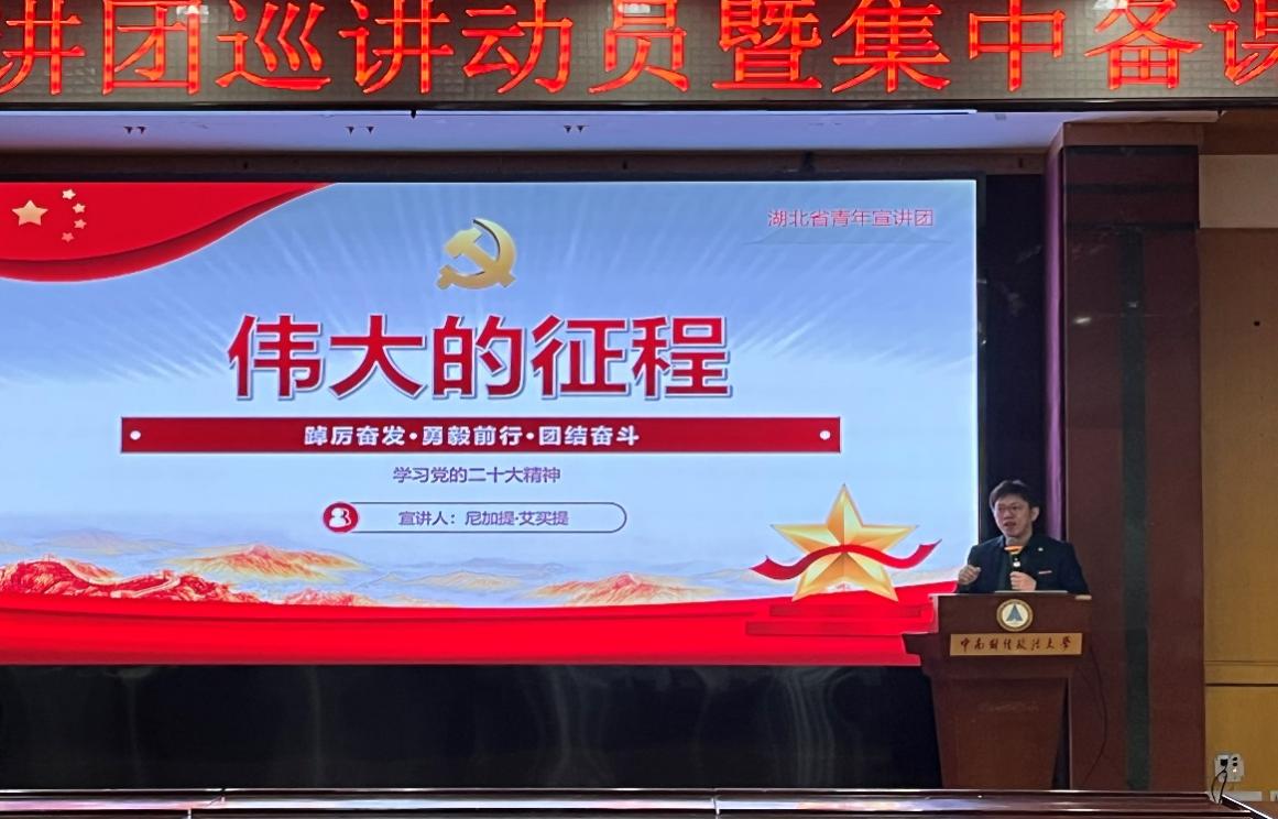 全国“第十三届高校辅导员年度人物”、工商管理学院专职辅导员尼加提·艾买提和湖北省辅导员素质能力大赛二等奖获得者、中韩新媒体学院专职辅导员黄祯辉进行主题宣讲。黄祯辉在宣讲中以红色歌曲为载体,从“觉醒之路”“信仰之路”“奉献之路”“奋斗之路”四个角度切入,用“小故事讲大道理”的方式分享各年代革命先辈的奋斗故事以及新时代我校“大学生年度人物”、研支团成员苏正民等身边人的故事,激励学生成为“有理想、敢担当、能吃苦、肯奋斗”的新时代青年。