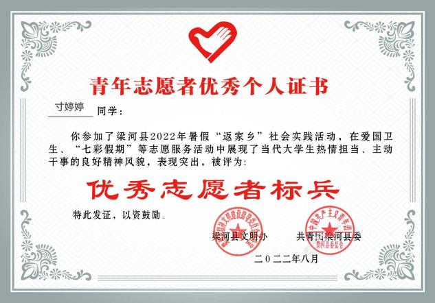 寸婷婷优秀志愿者标兵证书