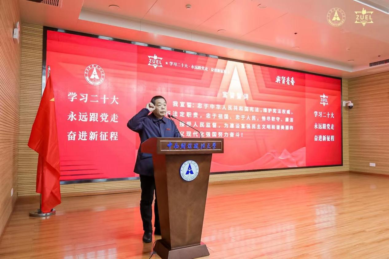 今年12月4日是我国第9个“国家宪法日”,庄严的国歌奏唱结束后,校党委书记栾永玉带领全体与会人员进行宪法宣誓,通过仪式教育号召大家学习宣传宪法,弘扬宪法精神,维护宪法权威。