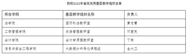 新闻网讯(通讯员 张瑞琴)近日,湖北省教育厅公布了2022年湖北高校省级优秀基层教学组织名单,我校“国际私法教研室”等4个基层教学组织入选。